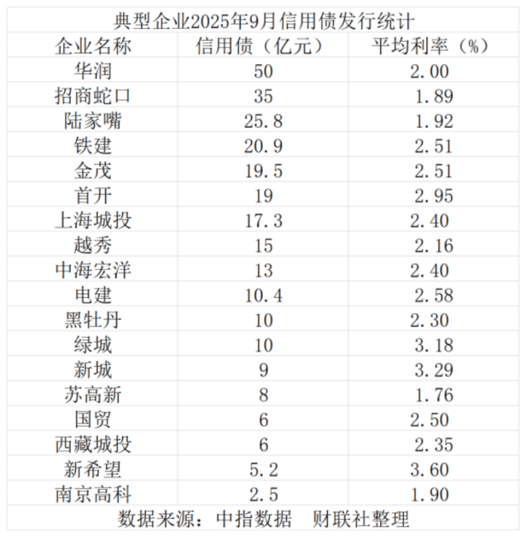 从发行主体看,房地产行业融资呈现“央国企主导、民企局部改善”的二元格局。一方面,华润、招商蛇口、陆家嘴、中国铁建等代表性央国企发行总额均超过20亿元,印证了其在债券市场的绝对主导地位;另一方面,绿城、新城、新希望地产等民企也成功发行信用债,合计融资约36.2亿元,融资渠道局部改善。部分典型企业具体数据见下表:
