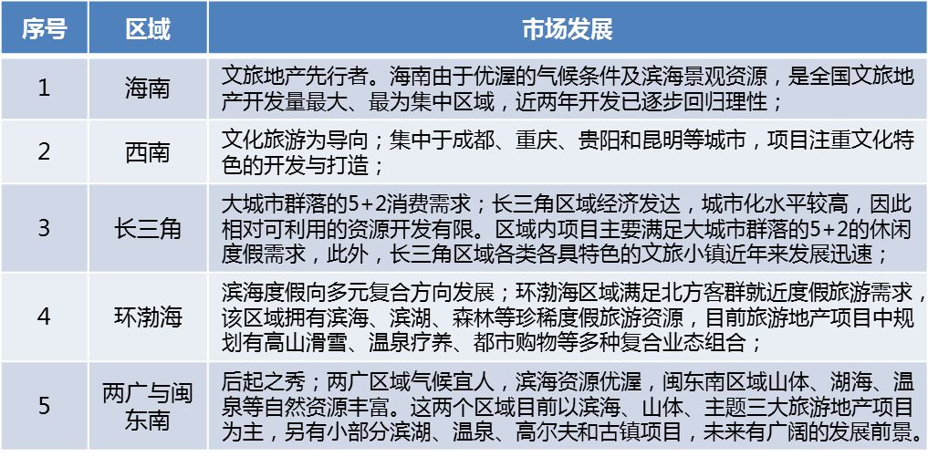 目前我国旅游地产市场主要呈现出「一线城市靠地产,二三线城市靠资源」的泾渭分明发展姿态。北京上海等一线城市旅游地产基本走「地产」路线,以人造景区、景点来配套住宅、酒店、社区等进行地产开发;而二三线城市主则走「观光或休闲度假旅游」路线,依托于区域优质旅游资源进行项目配置。同时由于中国地理条件、经济发展速度的不同,形成了经济发达、景观资源丰富的沿海地区旅游地产项目较为繁荣而中西部地区旅游地产项目数量稀少的区域分布失衡情况。目前我国文旅地产项目主要集中在自然资源较好海南、环渤海、长三角和近几年发展迅速的西南、两广和闽东南区域,六大区域基本覆盖全国文旅地产主要分部位置。