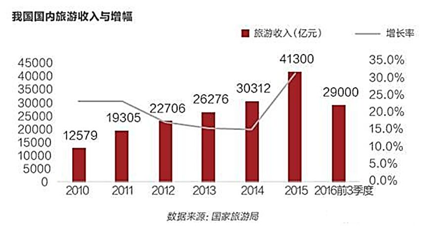 与房地产行业的衰退有所不同,中国旅游行业近年来可谓是发展迅猛,2015年我国旅游人数就已达到40亿人次,出境游1.2亿人次,总收入超过4万亿。旅游业增加值占全国GDP的比重提高到4.5%,占服务业增加值的比重达到12%,旅游消费相当于居民消费总量的10%。中国国内旅游、出境旅游人次和国内旅游消费、境外旅游消费均列世界排名前列。世界旅游组织预测,到2020年我国将成为世界排名前列旅游目的地和第四大客源市场。