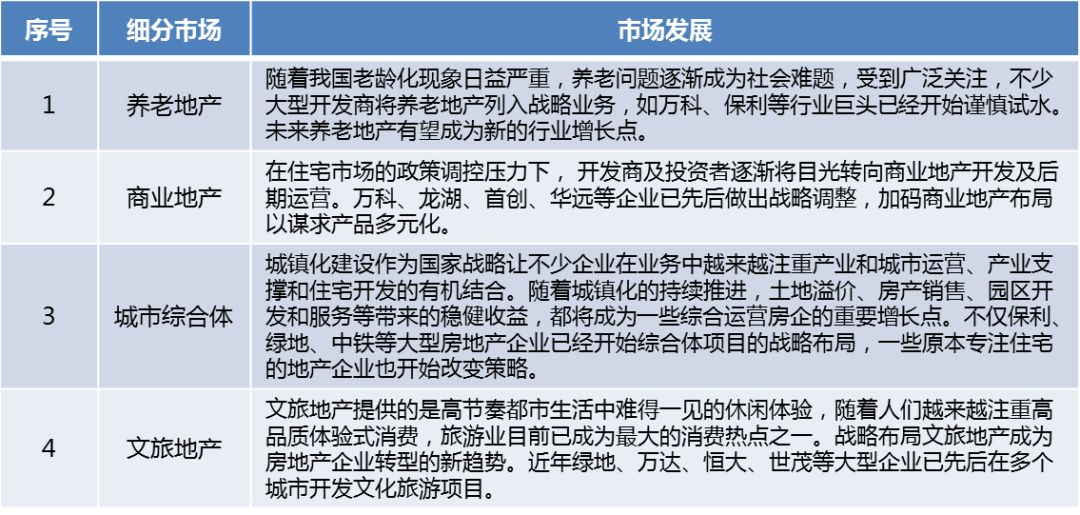 随着2017年「建立多主体供给、多渠道保障、租购并举住房制度」的提出,房地产市场迎来全面转型阶段,曾经的「中国经济发动机」行业风光不再,新阶段的来临也促使房地产企业必须加强转型和创新,才能持续适应目前行业发展的经济新常态。在房地产市场供给侧改革的驱使下,地产企业跨界资源融合,市场细分并向多元化转变发展,目前已向商业开发及运营、城市综合开发、养老地产、文旅地产等多个方向进行延伸创新。