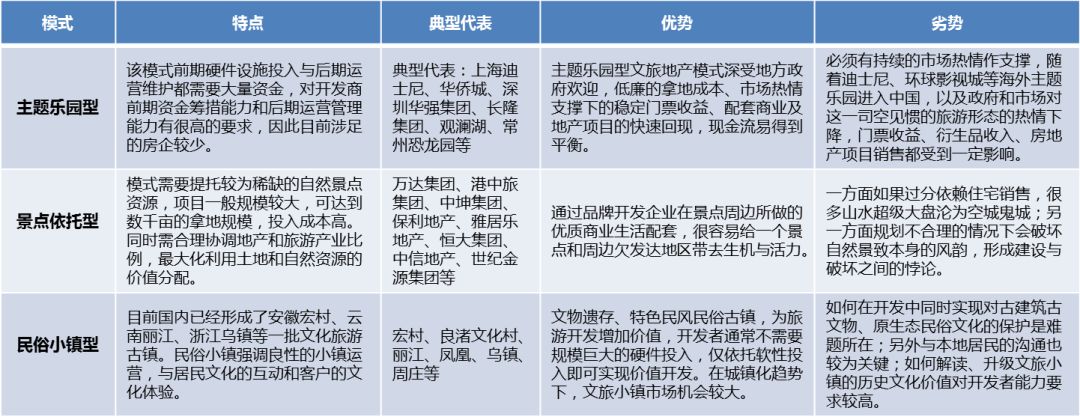 目前国内文旅地产主要三大模式:主题游乐型、民俗小镇型和景点依托型。