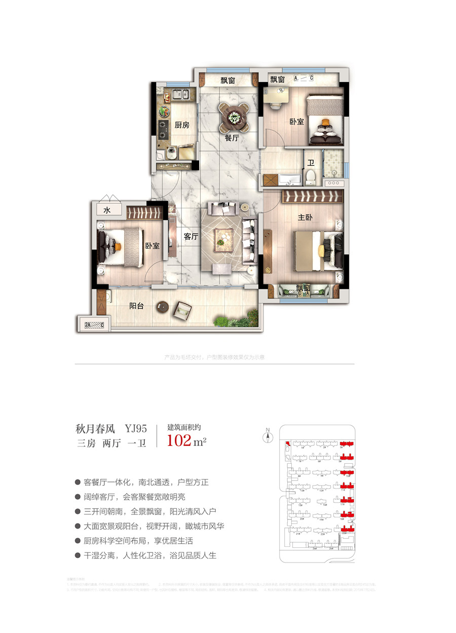 在售 南北通透 户型方正 开放厨房 带衣帽间 主卧带卫 干湿分离 飘窗 观景飘窗 双阳台
