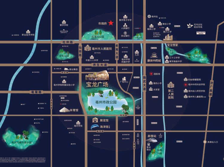 学校:亳州学院、风华高中、亳州市第一小学、亳州十八中、亳州学院附属学校以及其它幼儿等约60个教育资源及配套,这些是亳州主力教育消费群体,我们商业也非常适合教育主题,如亲子运动、早教机构、教育培训落位。
