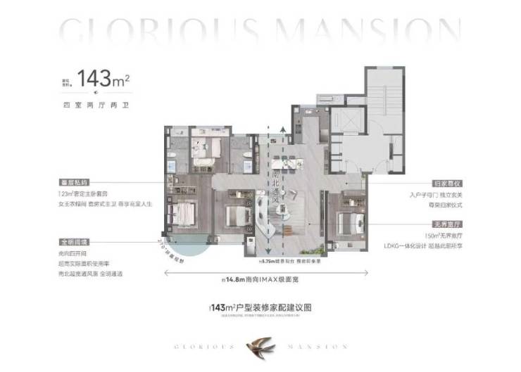 143㎡的四室两厅两卫户型采用LDKG一体化设计,餐客阳台无界融合,打造流畅的居家动线,留给生活更多的共享空间。约11.3米南向超大面宽,双卧朝南,采光通风俱佳。主卧套房设计,配备南向飘窗、独卫、双衣帽柜,打造便捷、私密的居住体验。这样的设计不仅满足了家庭生活的需求,同时也提升了居住舒适度。