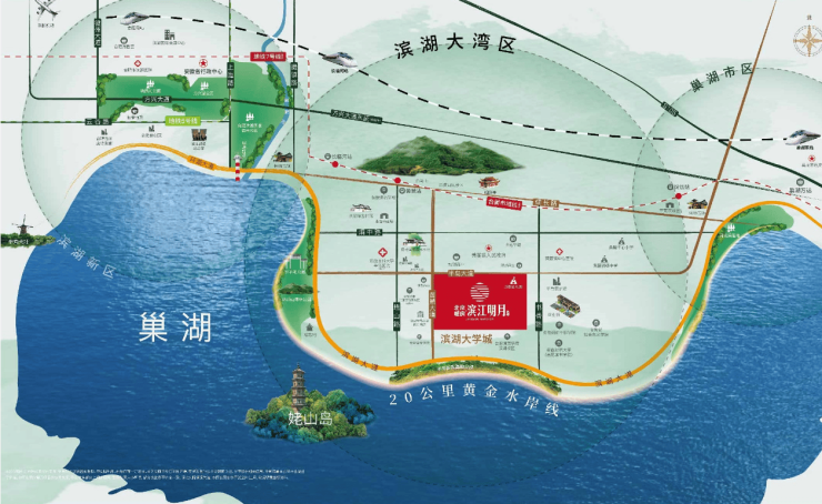 滨江明月府所处区域为巢湖市重点发展的滨湖新城,配套建设全面提速。交通方面,项目距巢湖东站仅12公里,G4221沪武高速入口5分钟车程,未来还将接入合肥地铁S4号线延伸规划,实现与合肥主城区的高效联动。区域内公交线路密集,出行极为便利。