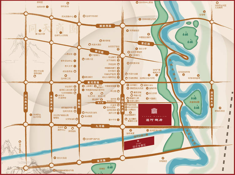 大运河公园、南环小学、市十中、信和商厦、悦港城、运河区图书馆、沧州银行、工商银行、市二院、颐和妇产医院