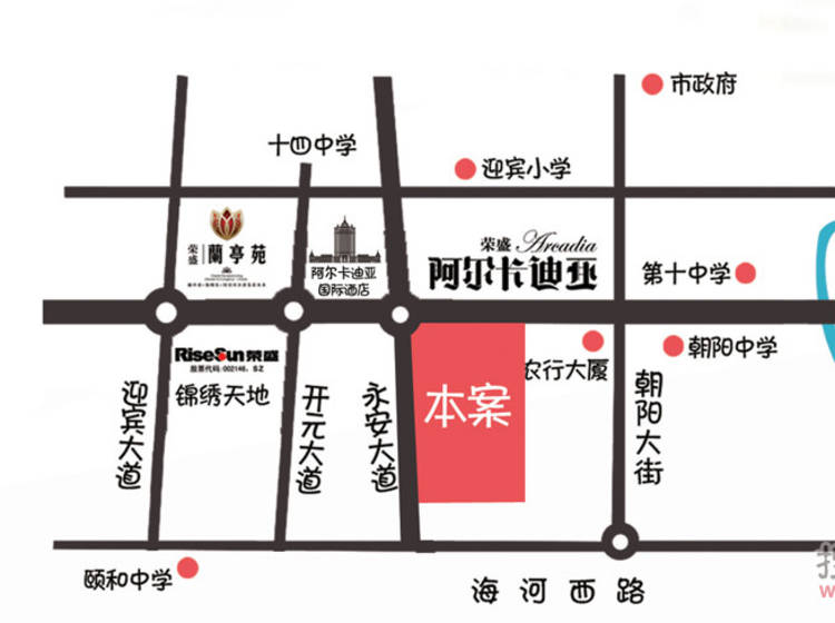 迎宾小学、黄河路小学、十四中、第一中学、建设银行、工商银行、农业银行、阿尔卡迪亚大酒店、荣盛国际购物广场、名人植物园