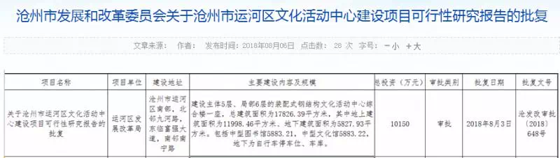 8月6日,沧州市发改委网站发布《沧州市重庆路小学建设项目变更项目建议书的批复》和《沧州市运河区文化活动中心建设项目可行性研究报告的批复》,公布两项目较新进展。