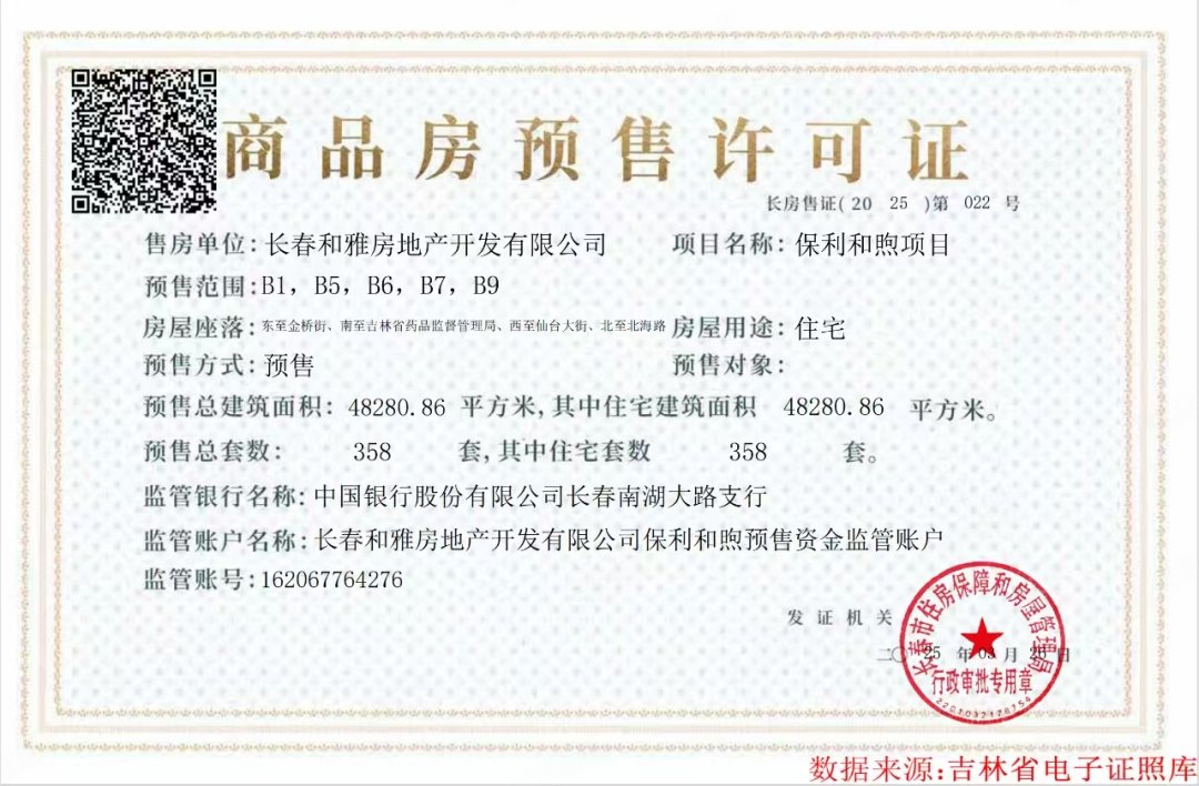 - 长房售证(2025)第022号 详情发证时间 2025-03-26绑定楼栋B7#、B5#、B6#、B9#、B1#证件照片