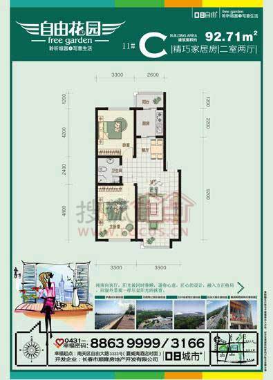 2室2厅1卫-自由花园 11栋 92.71m² 二室两厅一卫 C