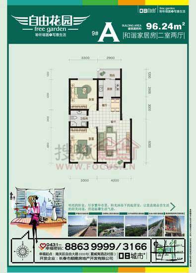 2室2厅1卫-自由花园 9栋 96.24m² 二室两厅一卫 A