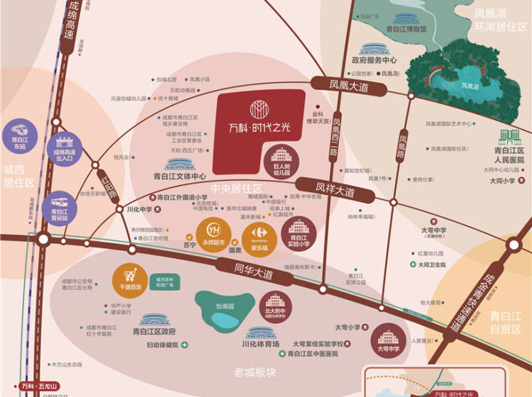 万科新城时代之光项目位于成都北自贸区青白江,该项目是万科在青白江的1号作品。项目属于青白江新城板块居住区,城市和生态兼得,项目步行距离的配套完善。还有4A景区凤凰湖生态湿地旅游度假区 项目由2梯2户的18层住宅和2梯4户的33-35层高层住宅高低搭配而成,梯户比极低;80%楼栋均为南北向,采光性和通透性俱佳;100%房源的客厅和主卧均不临街,全朝中庭;住宅楼下零底商,居住纯粹。 整个项目以“时代生活”为主题,融入空间布局中,形成了独特的“两轴三园七院”布局。