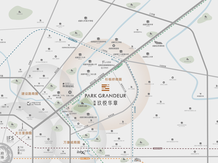 凯德·玖悦华章项目位于成都市成华区杉板桥路,杉板桥板块内,目前已有7号线,8号线双地铁配置,杉板桥路串联二环路和中环路,交通中转便捷通达性好;周边已有滨江天街、中央华城、天荟等成熟商业配套;项目2公里范围已有杉板桥公园、东郊记忆、麻石烟云公园、沙河城市公园等城市公园,项目南侧毗邻跳蹬河岸正在进行河道打造升级,城市人居自然环境舒适,项目周边已有四十九中、石室中学培华校区、成都市双语实验、建设路小学枫林校区、四川交响乐团附属小学等成华区优质教育资源。