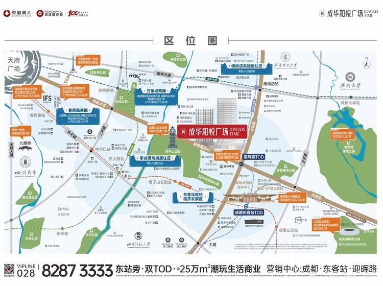 成华和悦广场位于迎晖路与中环路交汇处(迎晖路地铁站A/B口),地处东客站、攀成钢、万象城商圈核芯,以区域内唯一双TOD地铁上盖商业综合体之姿(东客站TOD、迎晖路TOD),缔造城市级商业核芯引擎。
