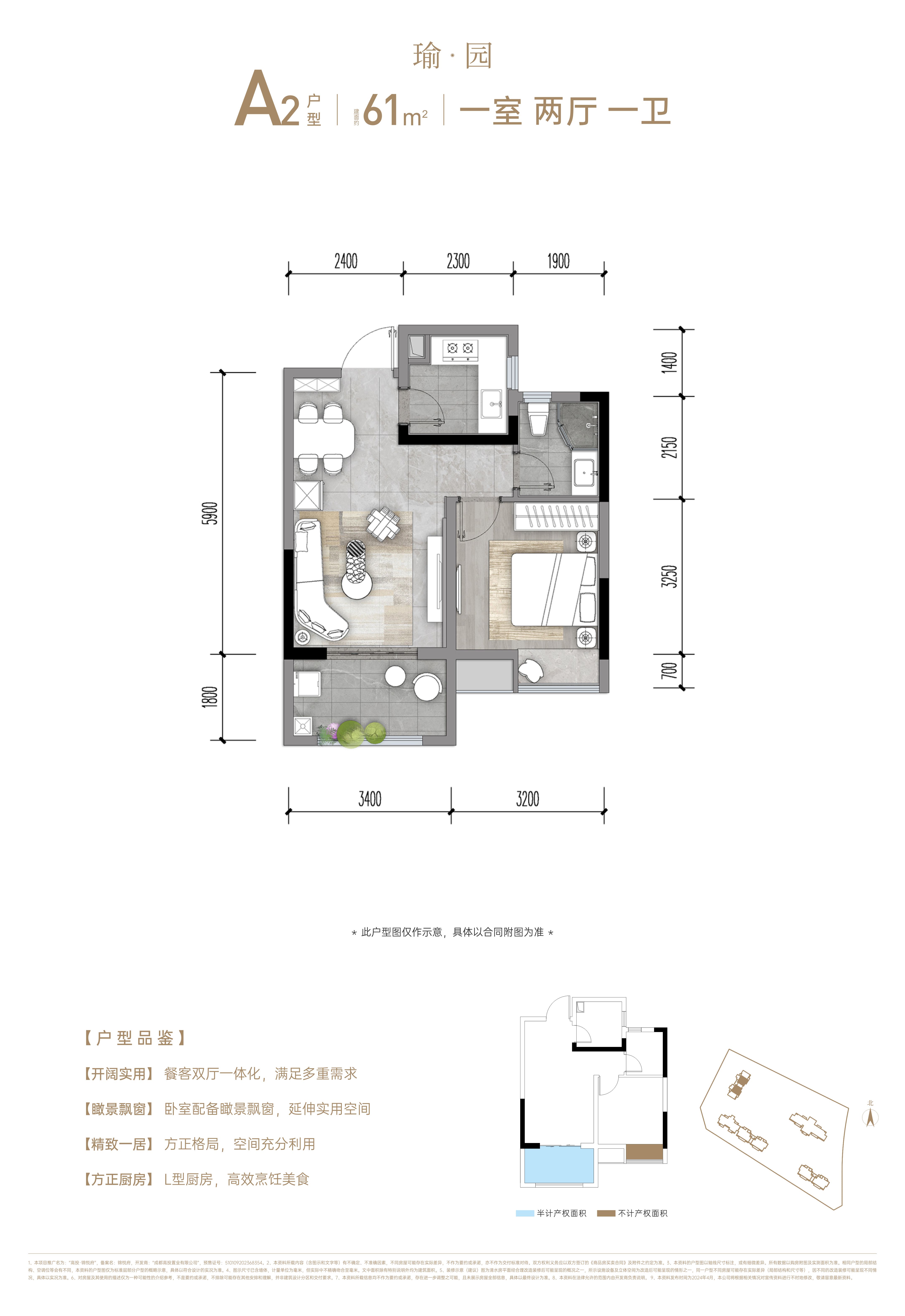 1室2厅1卫-A2户型-61㎡-一室两厅一卫