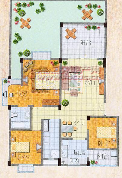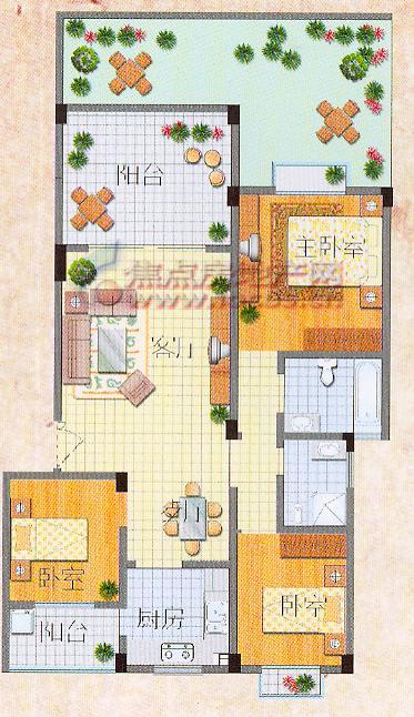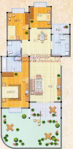 围合式建筑规划,川西民居风格,主力户型为147.71平米三室二厅二卫,餐厅紧邻厨房,充分考虑干湿分区,4平米的生活阳台方便实用,卧室带飘窗使视野更宽阔,3000多平米的超大中庭充分考虑到了休憩娱乐的需要。