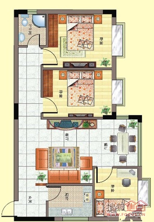 2室2厅1卫-天河盛景1、4号楼D户型2室2厅1卫1厨 97.56㎡