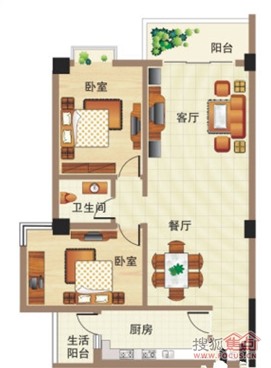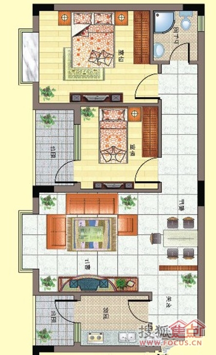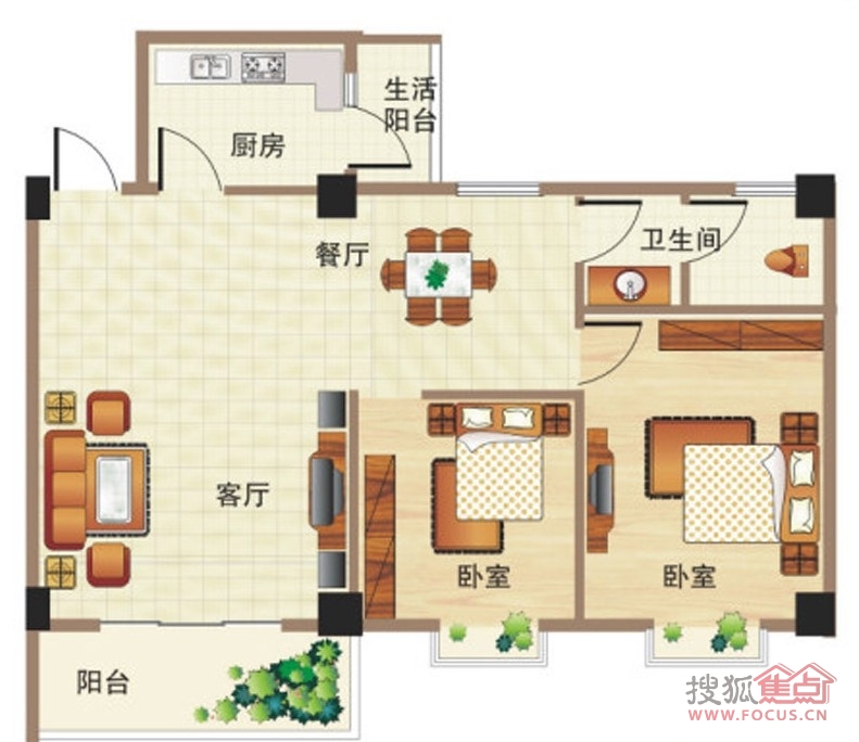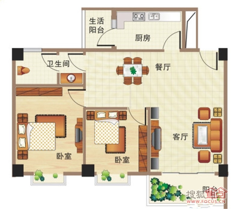 2室2厅1卫-天河盛景1、4号楼B户型2室2厅1卫1厨 98.56㎡