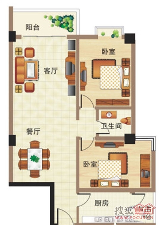 2室2厅1卫-天河盛景1、4号楼C户型2室2厅1卫1厨 95.12㎡