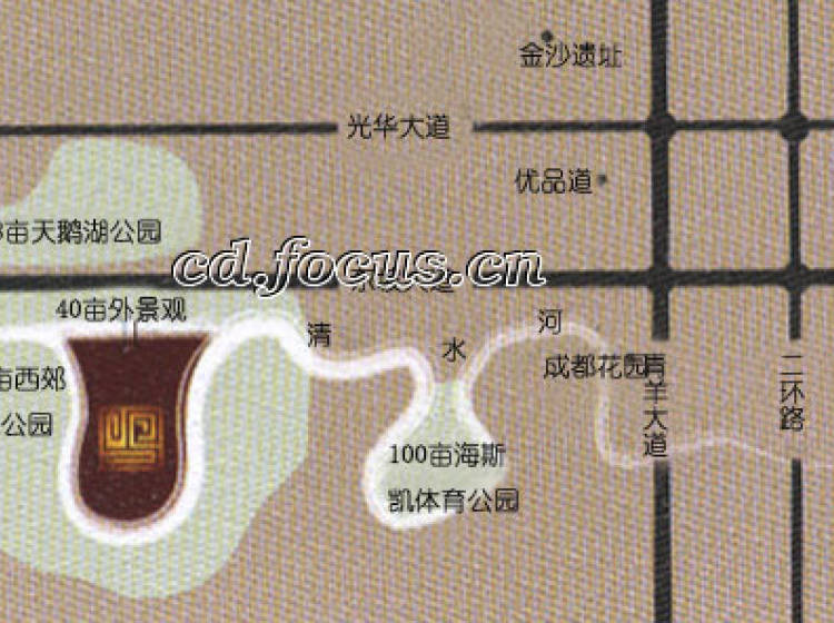 水映长岛浣谷由 505 亩西郊艺术公园、 100 亩海斯凯体育公园、 88 亩天鹅湖自然公园构成的成都城西生态公园区,建成后将成为成都三环内较大的市内风景区。水映长岛,正是这稀有城市风景区的中心。
