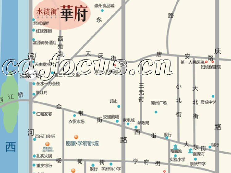水涟漪?华府濒临风景优美的川西母亲河——文井江,古蜀州八景之一的“西江晚渡客三千”即在于此。古蜀州厚重的历史文化赋予了愿景水涟漪活跃的时代感。