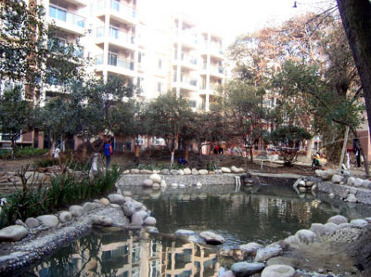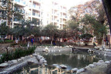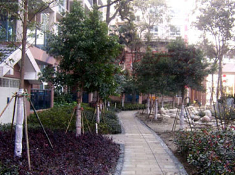 小区里的原生树木是大自然对生命的馈赠,30年前的幼苗,今日的原木林,都在向我们阐释着爱的传承。高大的香樟、洋槐、皂角树,草坪、花园、绿色林荫小道以及溪流、喷泉合理搭配,色彩丰富;活水和音乐的交融将小区构筑成自然、流动的动态景观;走廊、小亭、休憩和健身场所等人性化的设计,都为大家营造了一个温馨自然的人文环境。