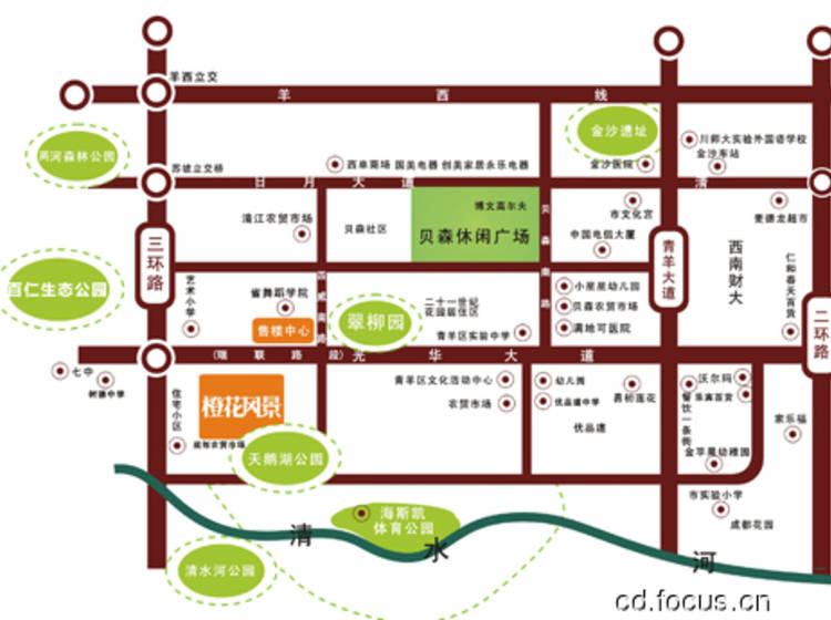 休闲设施:市文化宫、天鹅湖公园、海斯凯体育公园、西郊艺术公园、翠柳园、青羊区文化艺术中心、贝森休闲广场