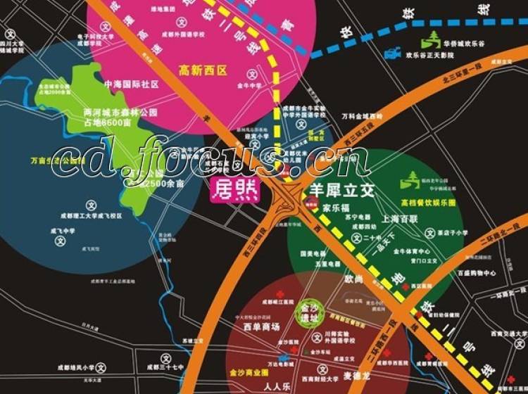 居然,毗三环,伴羊西,守地铁,依轻轨,左临金沙遗址博物馆,右傍三大万亩级公园。周边有家乐福、欧尚、人人乐等的购物场所,享有高新西区的国际化科技氛围和大、中、小名校的教育氛围。