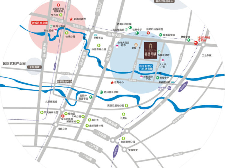 邑品天都位于新都新城区。成都医学院对面,紧邻石油大学、四川音乐学院。规划中的地铁和轻轨站点,离项目近在咫尺。 2路,4路车等公交车直达本项目。