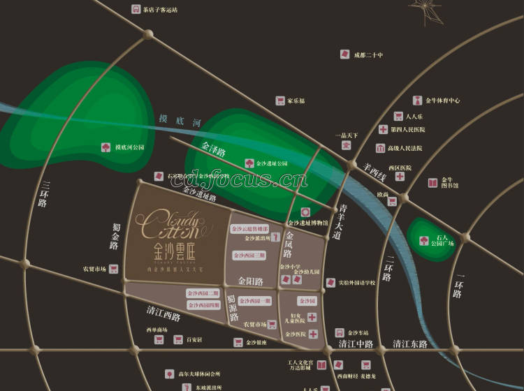 「金沙雲庭」位于金沙遗址路,被摸底河公园、金沙遗址公园两大公园环绕,距金沙遗址博物馆仅200米。是内金沙高尚住区内最后的可开发的低密度风景住区。