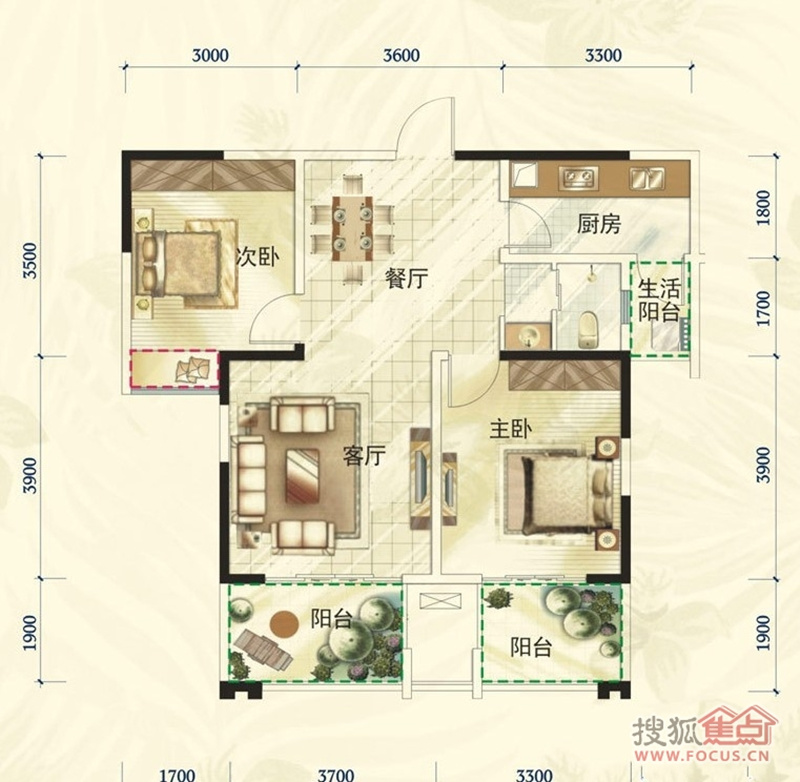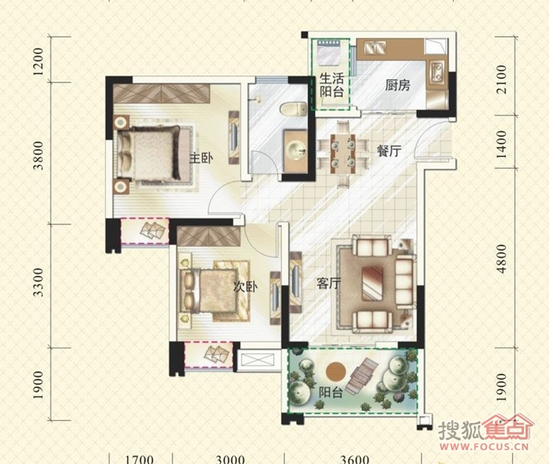 2室2厅1卫-6、7号楼B2户型2室2厅1卫1厨 84.00㎡户型