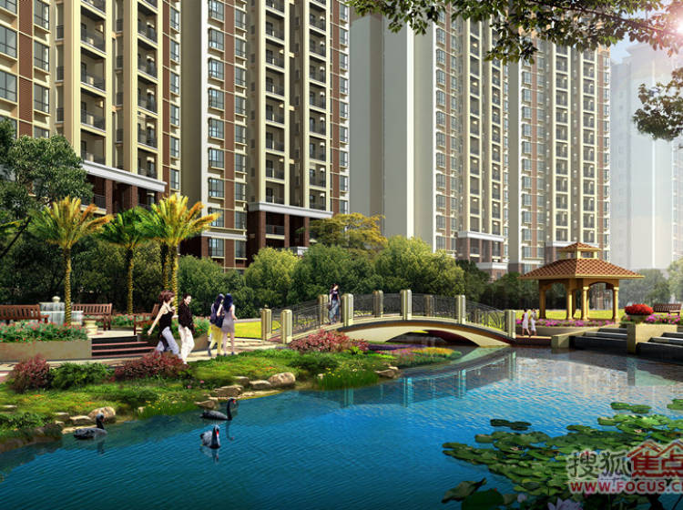 绿洲国际项目景观采用地块中部南北滨水主题景观和两个中庭景观组成,向东西两侧发散形成组团式布局。在小区中央靠主景观附近设置一处1645平方米的全民健身活动场地,同时,利用行列式住宅之间的空间布置集中绿地,为小区居民提供良好景观资源和室外活动场地。