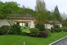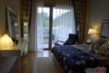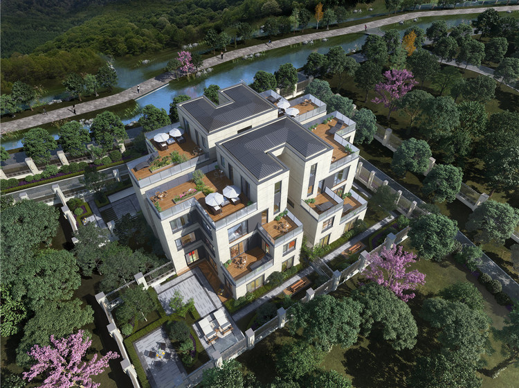 山外山整体项目沿袭新亚洲建筑风格,聘请美国JNJ建筑团队以及北京墨臣公司,以青山为背景,山的坡度为根基,溪流为灵魂,树木为骨架,匠心将设计灰色瓦屋面与大片低反射落地玻璃的建筑体嵌入山景之中。设计师重新思考如何将山景自然元素的原生呈现在建筑中,所以每一户都打造专属花园露台,将封闭的墙面打开打造超大观景落地窗,引入天然阳光与空气,增强自然采光与室内通风,较大化的利用周边得天独厚的自然环境。