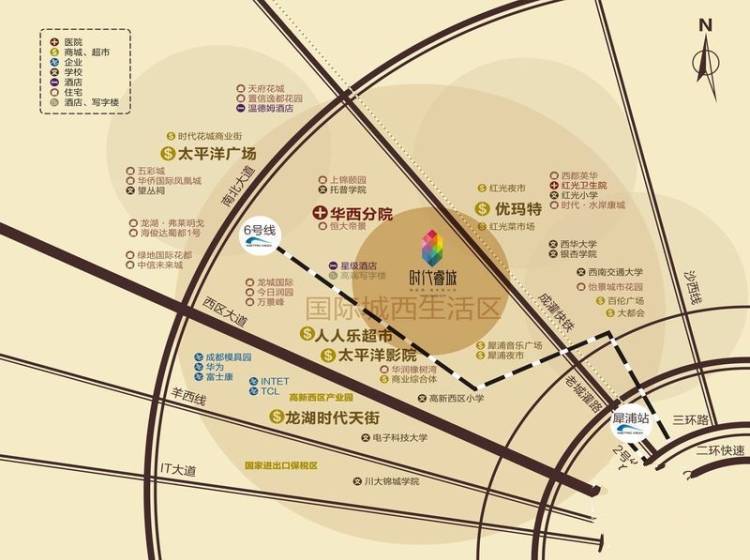 时代睿城位于老成灌路与西区大道之间,隶属成都高新西区。临人人乐、太平洋影城,华西分院,周边还有摩托罗拉、IBM、英特尔、华为等众多高新技术企业,并毗邻西华大学、电子科大、西南交大等学校。