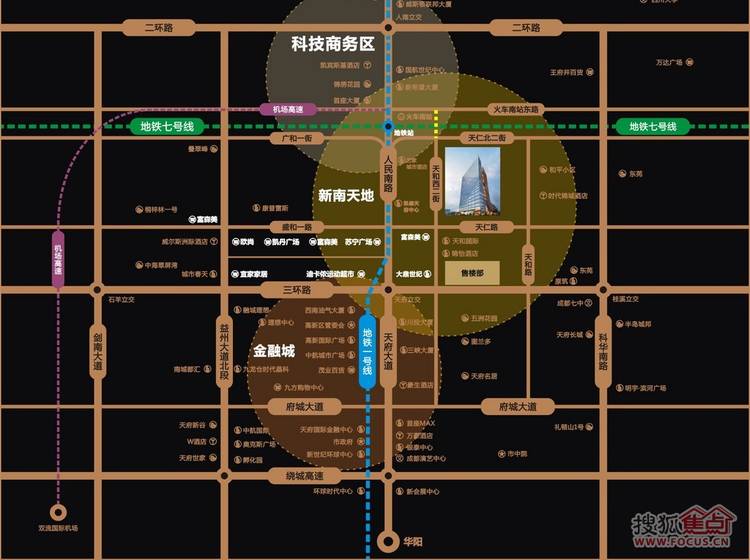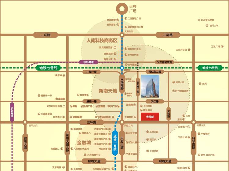 从天府广场向正北方向出发,右转进入蜀都大道,右转进入顺城大街,直行进入大业路,左转进入锦兴路,靠右转进入复兴桥,直行进入新南路,靠左进入科华北路,靠左进入科华中路,直行进入科华南路,右转进入天仁北二街,左转进入天和西一街到达终点