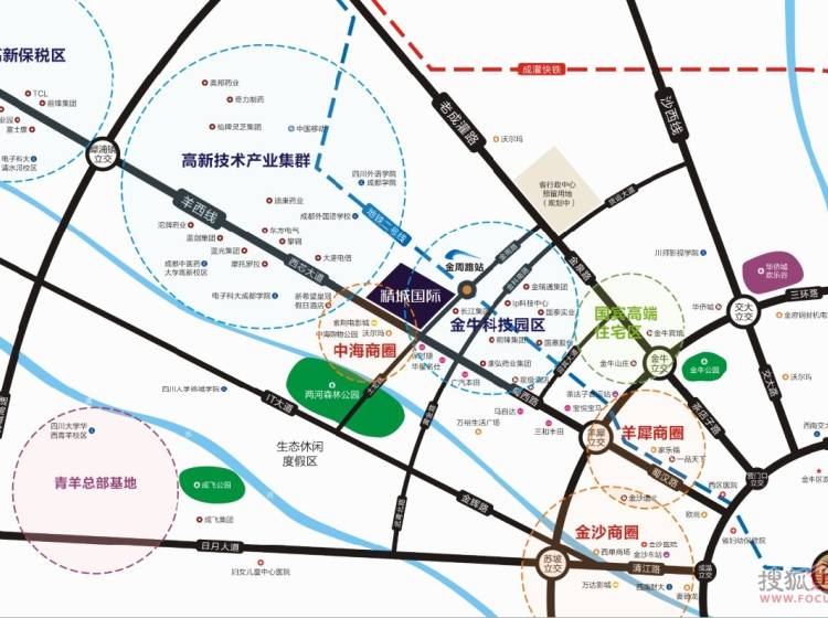 地段西贵:高新西区与羊西线遥相呼应,环绕国宾、金沙、成飞等高尚板块,汇聚汽车、电子、IT、通讯、软件、医药、教育等众多产业,产业人口超60万。羊西线、IT大道、成灌高速,迎宾大道、三环路、地铁2号线等形成立体交通网络,17、30、54、96路等十多路公交车必经之地,交通四通八达。