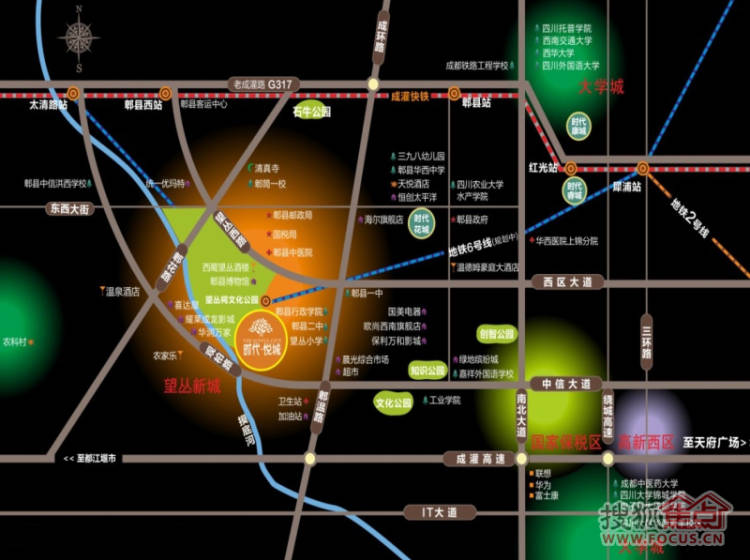 时代悦城由望丛小学、郫县二中、郫县行政学院环绕;西北侧紧挨商业中心,未来集餐饮、娱乐、休闲、购物于一体。东侧有晨光综合市场;并且项目前后紧邻卫生中心及郫县中医院。