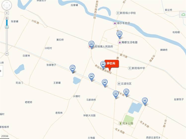 静怡苑交通方面:距郫县6公里,距成都25公里,沙西线2公里,距317国道2.6公里,距绕城高速入口3.5公里, 新民场经济:工业方面:共有工业企业102个,主要是食品生产;农业方面:新民场被誉为西部花乡,同时盛产水果蔬菜,销往四川省内各地;旅游产业,鹿野苑石刻博物馆和雄龙天工根石博物馆,徐堰河、柏条河横贯全镇。