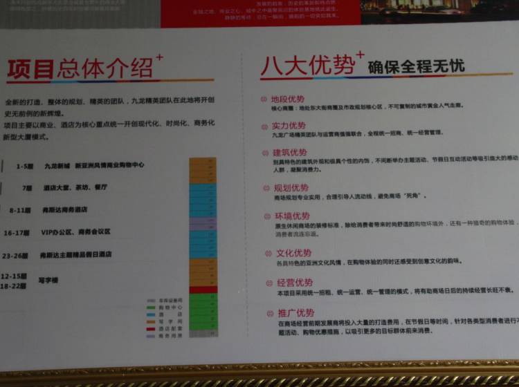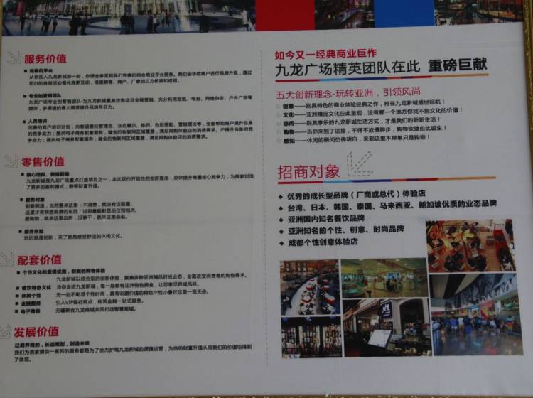 九龙318项目规划为商场+酒店+公寓+写字楼复合型商业体,立足于成都传统商圈,依托良好的区位优势及便捷的城市立体交通网络,通过打造集购物、餐饮、娱乐、异域文化为一体的情景街区式购物场所,使更多的人加入到异域体验式悠乐生活。九龙318借鉴海内外前沿商业模式,精选亚洲时尚精粹,移植韩、日、港、泰文化原味,形成了独特的“异域小资潮,室内步行街”的商业模式,将特色的文化元素,纳入场馆内经营,为消费者营造出绝妙的空间文化体验感。F1-F4以购物为主,异域休闲为主,F5主要以餐饮为主。其中1F首尔街头;2F闲暇九龙城;3F秘游京都;4F清迈风情街;5F台湾士林。