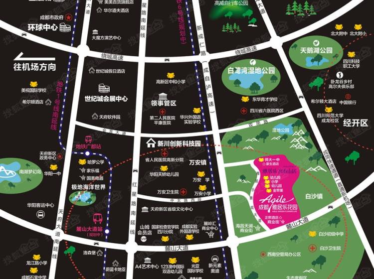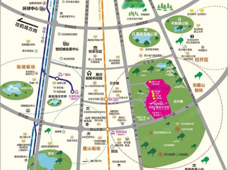 教育:项目内金苹果幼儿园、师大一中已投入使用。成都市实验外国语学校(西区)、麓山国际光亚学校、成都美视国际学校、成都七中高新校区。
