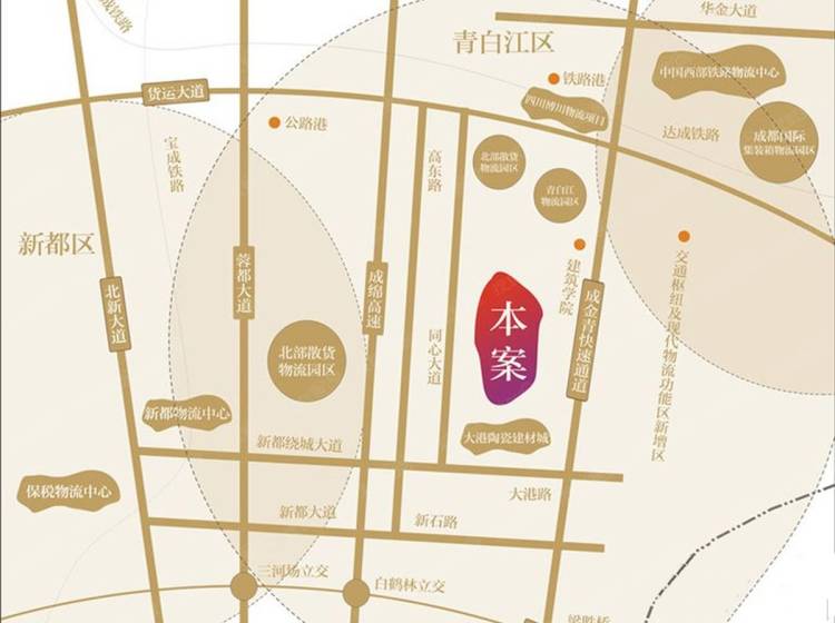 乐城乐家项目位于成金青快速通道旁,距青白江区5公里,距成都市15公里,距离大湾货运站、成都国际集装箱物流园区仅2公里。青白江铁路集装箱中心站接宝达、达成、成昆等多条铁路,形成以成都为中心的铁路物流网,网络西南各域;成绵、成南、成金青、绕城以及大湾散货园区,构筑了成都市半公路物流网;待第二绕城全面通车后,项目区位优势将进一步凸显。