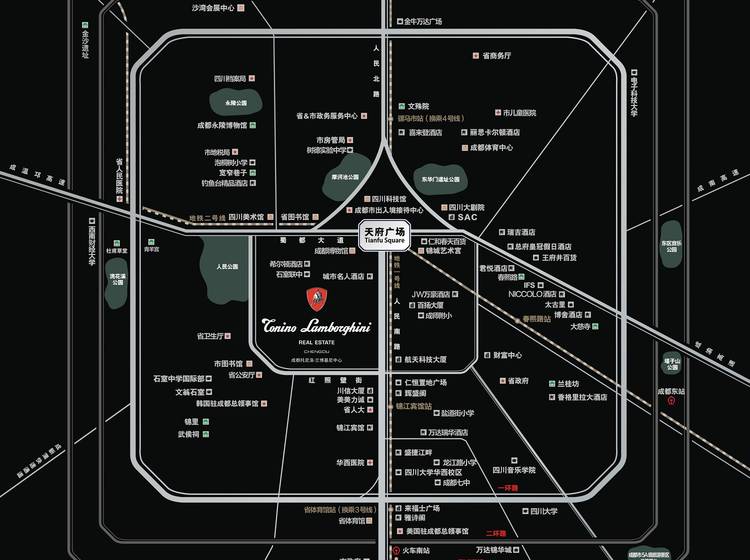 成都托尼洛•兰博基尼中心位于新一线城市成都的心脏位置——天府广场一侧。同时,项目还毗邻拥有“成都长安街”之称的人民南路,扼守着“西部华尔街”的咽喉,这里作为成都城市发展的主动脉,被誉为”成都中轴“,人民南路及其沿线,一直延伸至高级重点打造新区——天府新区的核心腹地,沿途密布着这座城市各大政务机关、各大国内外知名企业、重点名校、各大博物馆、重点商圈和重量级商业综合体等,是成都举足轻重的商脉、文脉和人脉,作为开启这段”中心之路“的成都托尼洛•兰博基尼中心项目,其地理位置的核心优势自然不言而喻。