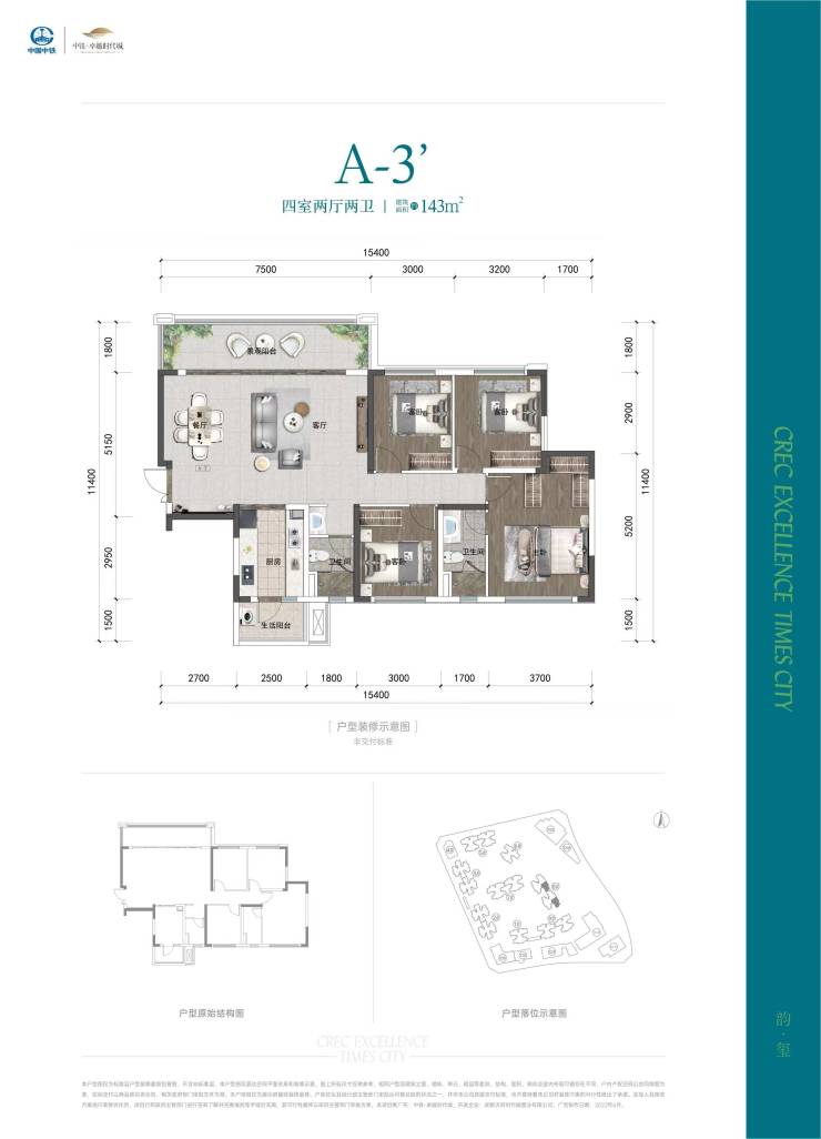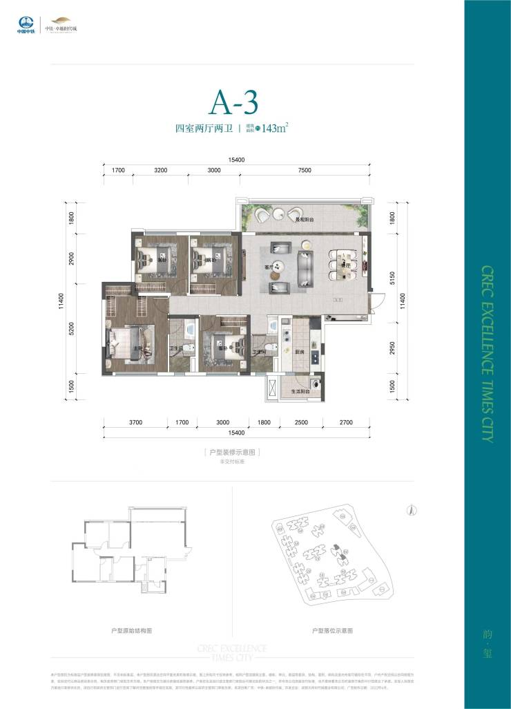 A3户型——建筑面积约143㎡四室两厅两卫