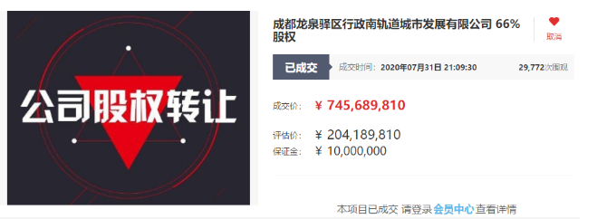 2020 年 7 月 31 日,成都龙泉驿区行政南轨道城市发展有限公司 66% 股权进行了竞拍,挂牌起始价 20418.981 万元。该场拍卖从上午 11:18 开始,一直持续到晚上 21:09 才结束,竞拍 1064 轮,最终成交价 74568.981 万元,溢价率高达 265.2%,由 N3146 号万科竞得。