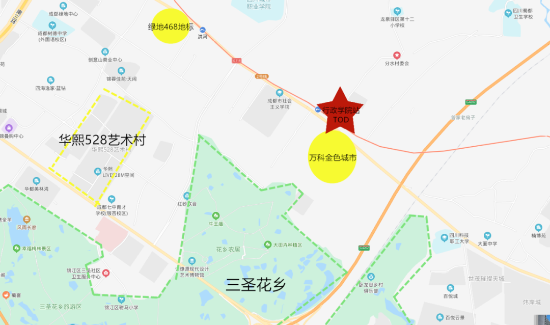 行政学院站TOD位于市区与三圣乡交汇处,一体化设计范围1305亩,东临环城生态带、西近绿地468、南邻三圣花乡旅游区、北邻成都东站,距市中心约12公里,位于东进桥头堡。项目属于成都轨道交通2号线(已运营)与9号线(规划建设)行政学院换乘站点,核心建筑面积49万平方米,将由大型商业综合体、五星级酒店、超甲办公、创意街区、住宅、学校等业态构成。该项目以“东进门户、创驿绿谷”为主题,建成后将成为成都向东的生态公园、城市门户。