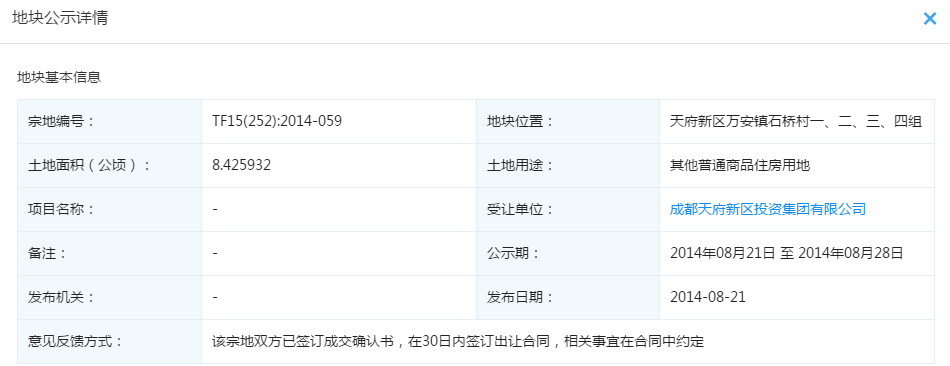 多项公开信息将麓山上院项目的详情展露。实际上,其项目所在地块,位于天府新区万安街道石桥村一、二、三、四组,是由中信城开从成都天府新区投资集团手中收购而来。