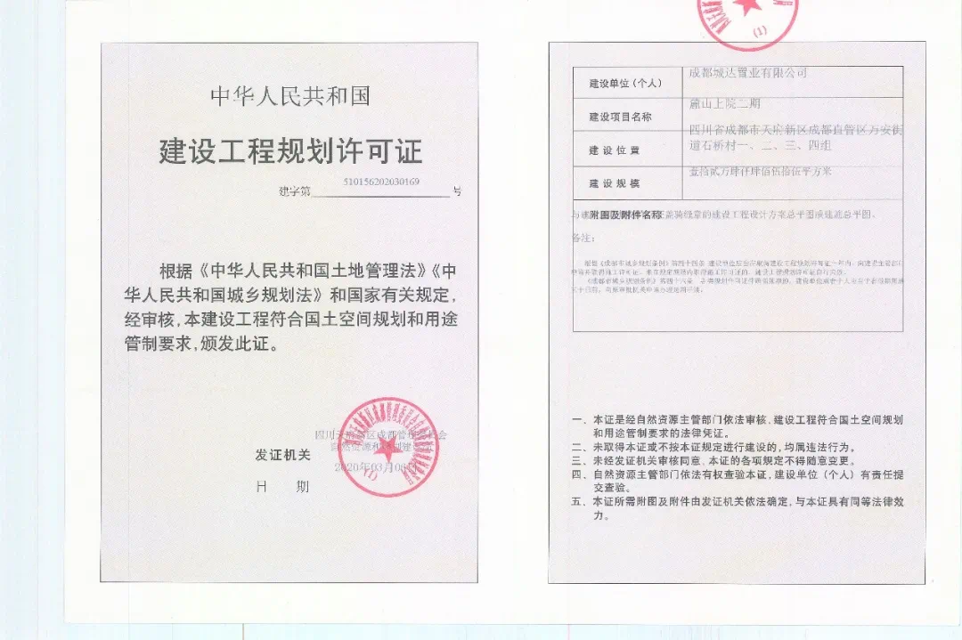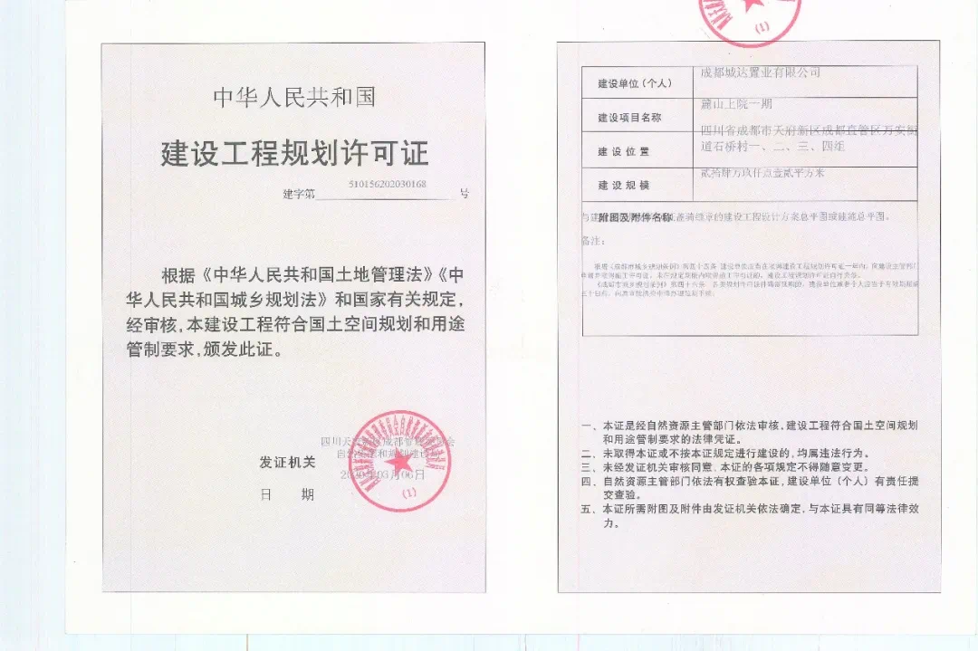 近日,成都天府新区一项目取得两张建设工程规划许可证,项目案名为麓山上院,由成都城达置业有限公司开发,此次获得的建设工程规划许可分别涉及其一期、二期。