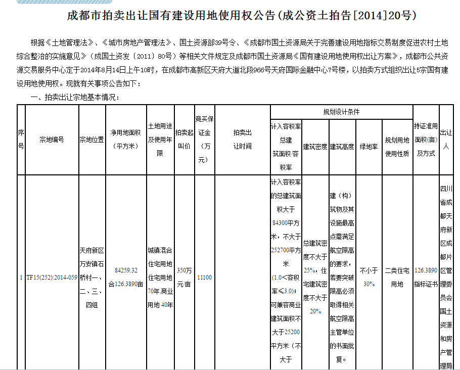 麓山上院项目地块是由成都天投在2014年8月14日以350万/亩的单价底价竞得,用地面积约126.3890亩,商住用地,容积率3.0,当时成交总价约4.42亿。