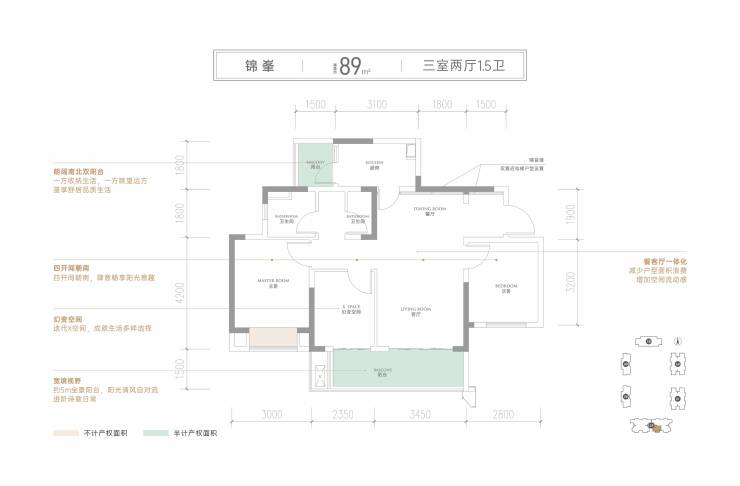 锦峯--建面约89㎡(三室两厅1.5卫)