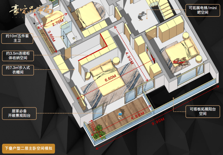 以建面约230㎡下叠户型为例,南向9.9m面宽,三开间朝南。三面宽是豪华级叠拼硬性要求。